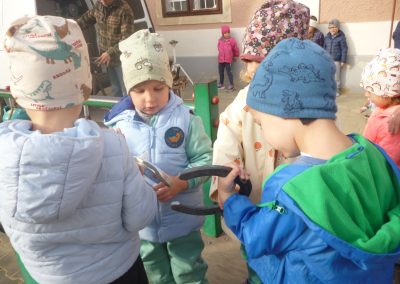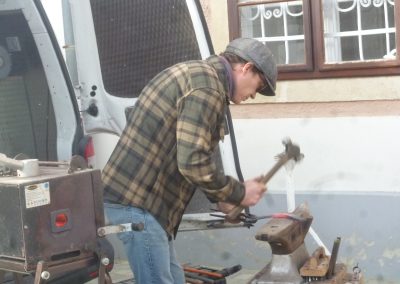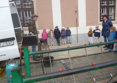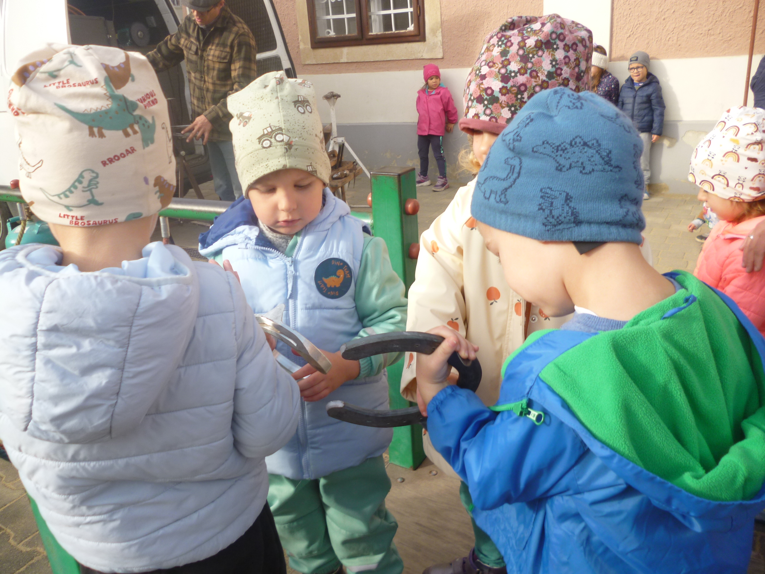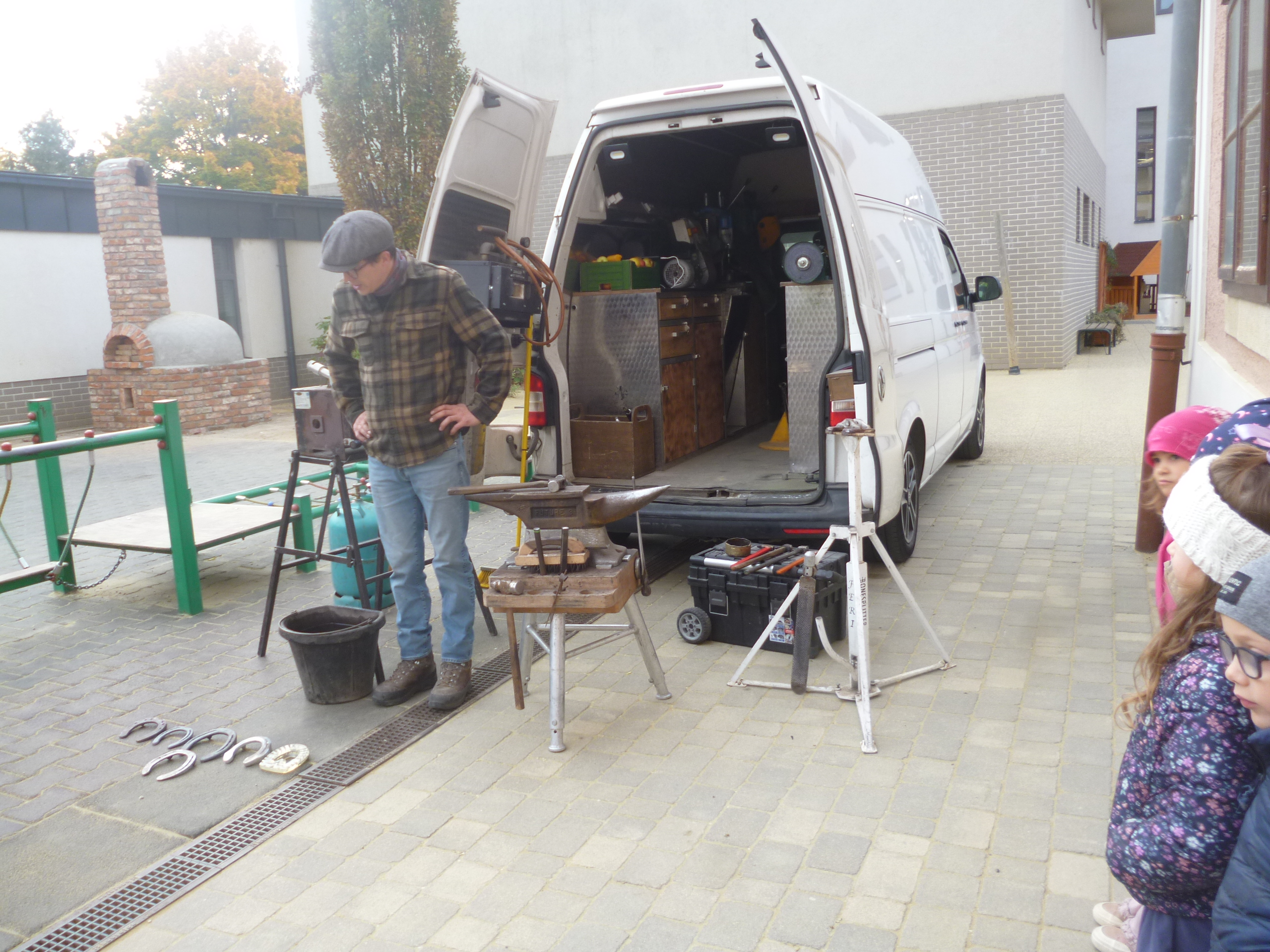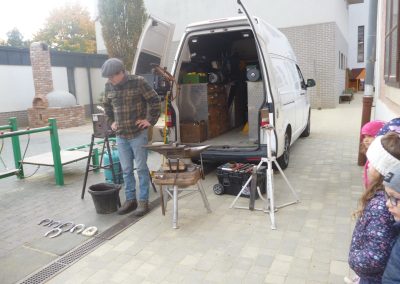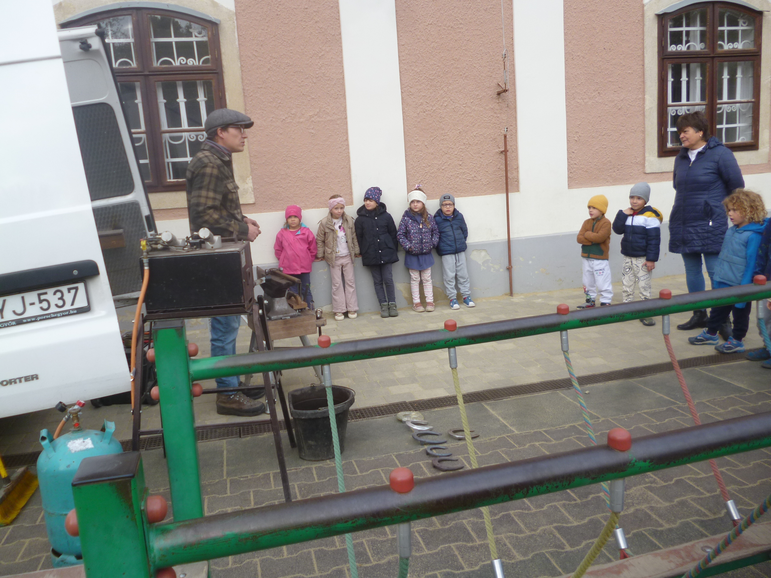 Ehhez Boros Marci édesapját, Boros Ferencet kértem meg, aki patkoló kovács. Mobil kovács műhelyével tábort vert az ovink udvarán. Amikor leértünk az udvarra már a kohóban izzott a tűz, ami elbűvölte a gyerekeket. Szeretettel köszöntötte őket és bemutatta mi mindent rejt a kocsi belseje. A használati eszközöket kézbe is foghatták a gyerekek. Patkót kovácsolt nekünk ezen az alkalmon Marci apukája. Patkó készítés folyamata közben mesélt a szakmájáról, a versenyekről, ahol megmérettetnek itthon és külföldön egyaránt. A ló ismeretéről, szeretetéről is tanúbizonyságot tett. Megismerkedtünk különféle patkókkal, megtapasztalhattuk súlyukat, méret- és anyagbeli különbségüket. Kézbe vehettük a kisebb-nagyobb patkószegeket is. A gyerekek türelemmel, érdeklődéssel követték a patkó elkészültét.