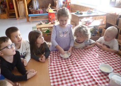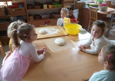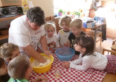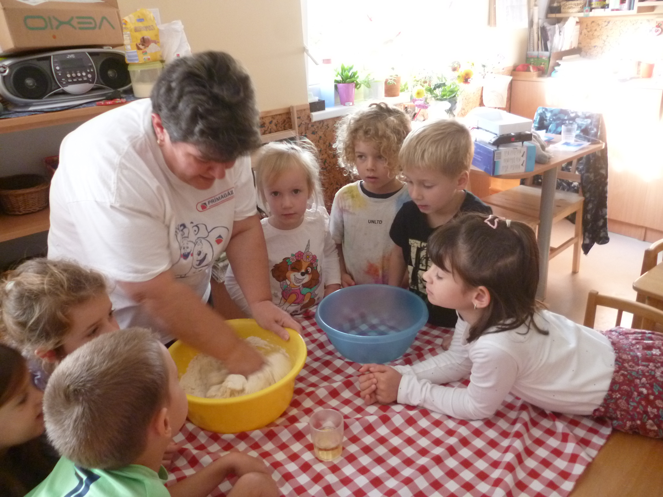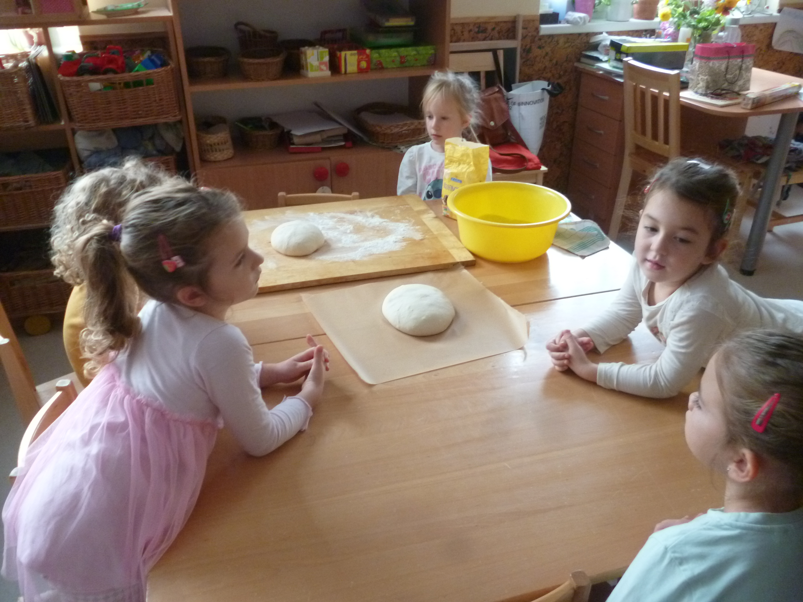Az iskola könyvtárában, Éva néni készült nekünk előadással. Aratástól a búza őrlésén át végig követhettük a folyamatot a kenyér sütéséig.  Megismerkedtek nagycsoportosaink, milyen módon vetettek és arattak a régi időkben. Éva néni meglepetése: Mátyás király kenyere, a magyar népmese sorozatból. Ezt a mesét a gyerekeknek az oviban előző nap meséltem. Most ’aha’ élményként élték meg a mesét. Könyvet kölcsönöztünk, a könyvtárból, amiben képes és írott formában is találkoztak a gyerekek azokkal az ismeretekkel, melyet a kisfilmben láttak. ’Búzaszemtől a kenyérig’ kísértük végig a folyamatot az oviban is, ahol tapasztalás útján találkoztak a gyerekek a finomliszttel, rétesliszttel, búzadarával. Közösen készítettünk kenyeret, sajnos elsőre nem sikerült a sütésünk, de másnap otthon sütött kenyérrel kárpótoltam a gyerekeket.