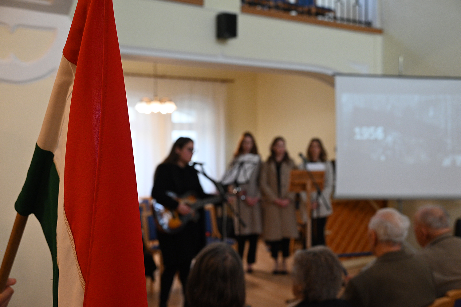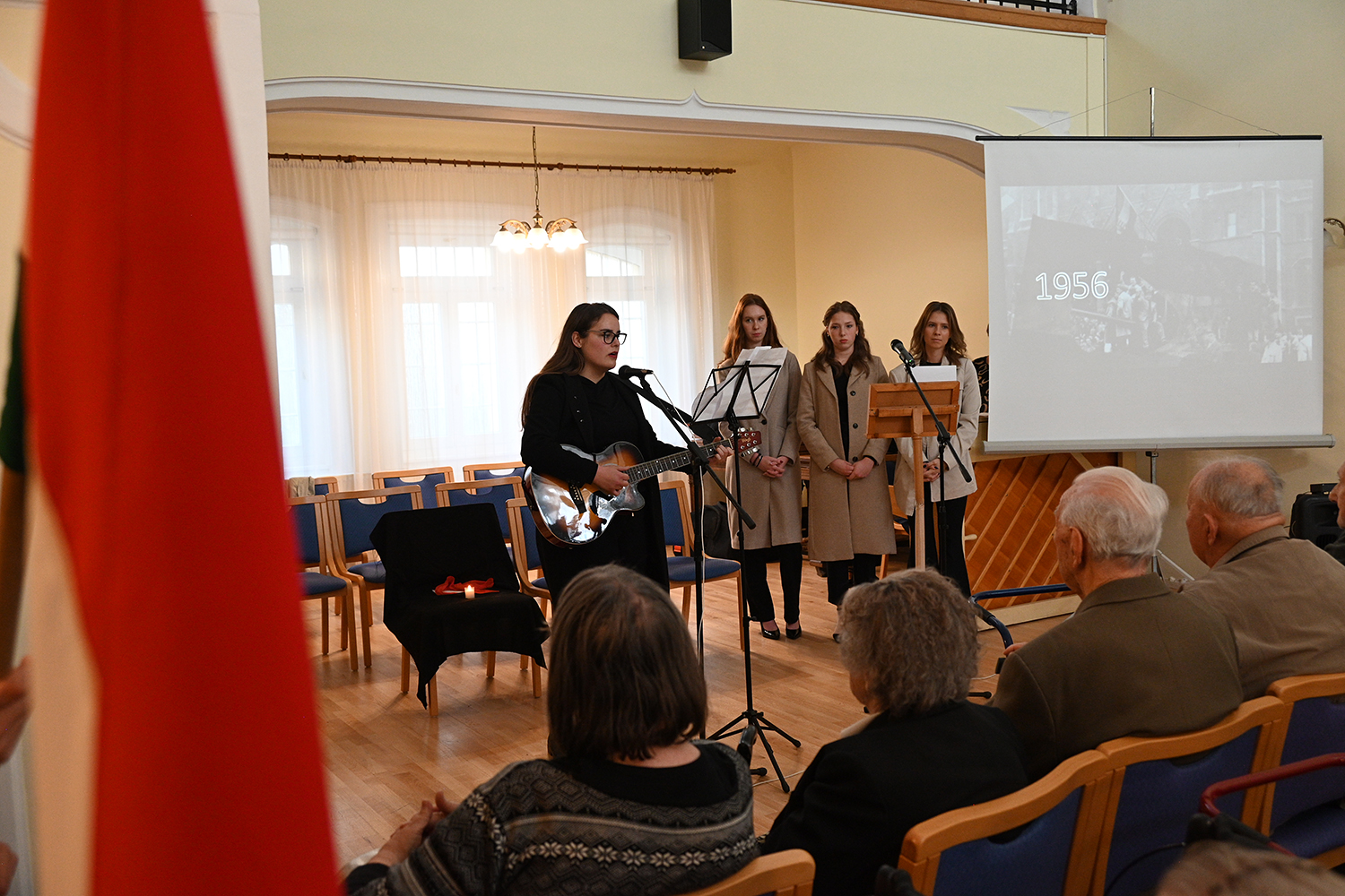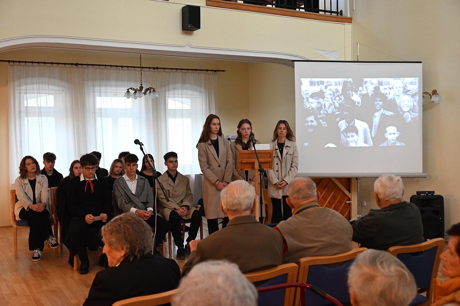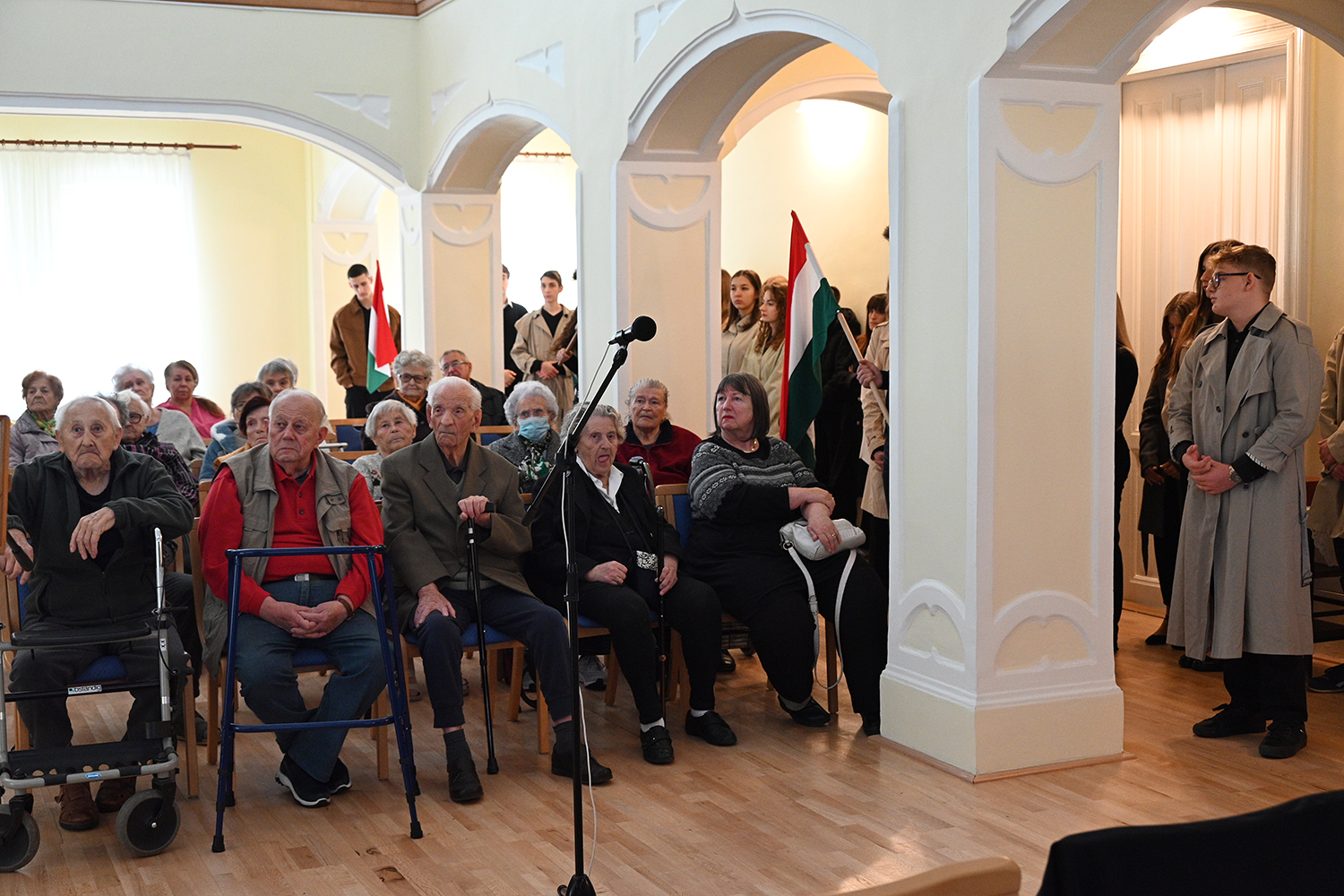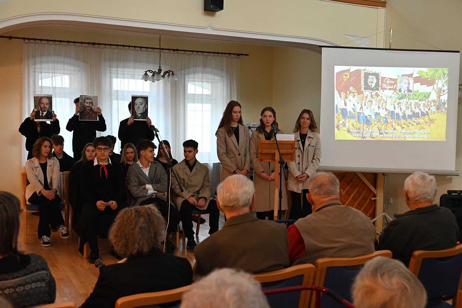 Okt. 22-én az 5. órában emlékeztünk meg a 11. évfolyam műsorával nemzeti ünnepünkről, az október 23-i eseményekről. A diákok által életre keltett jelenetek, emlékképek, dalok és versek méltó módon mutatták be az akkori eseményeket, történéseket. Nemcsak diákjaink láthatták ezt a színvonalas megemlékezést, hanem a szeretetotthon lakói is, hiszen nekik is előadták a műsort. Az otthon egyik lakója a műsor végén szót kérve hálásan, meghatódva meg is köszönte és elmondta, mennyire megérintette a megemlékezés, hiszen ő maga is tanúja volt az óvári eseményeknek.