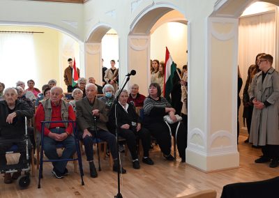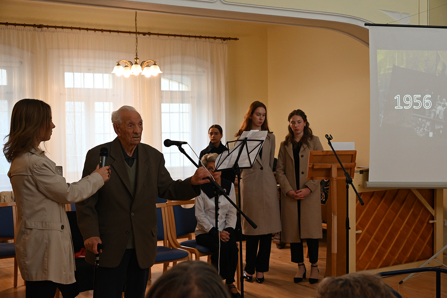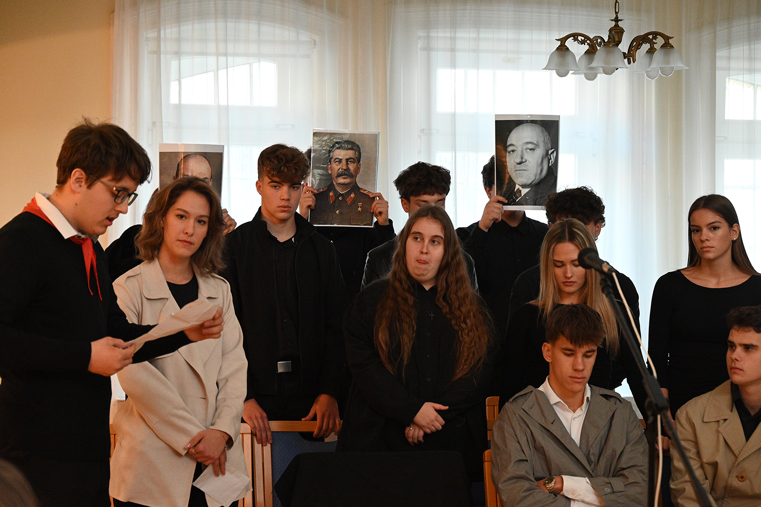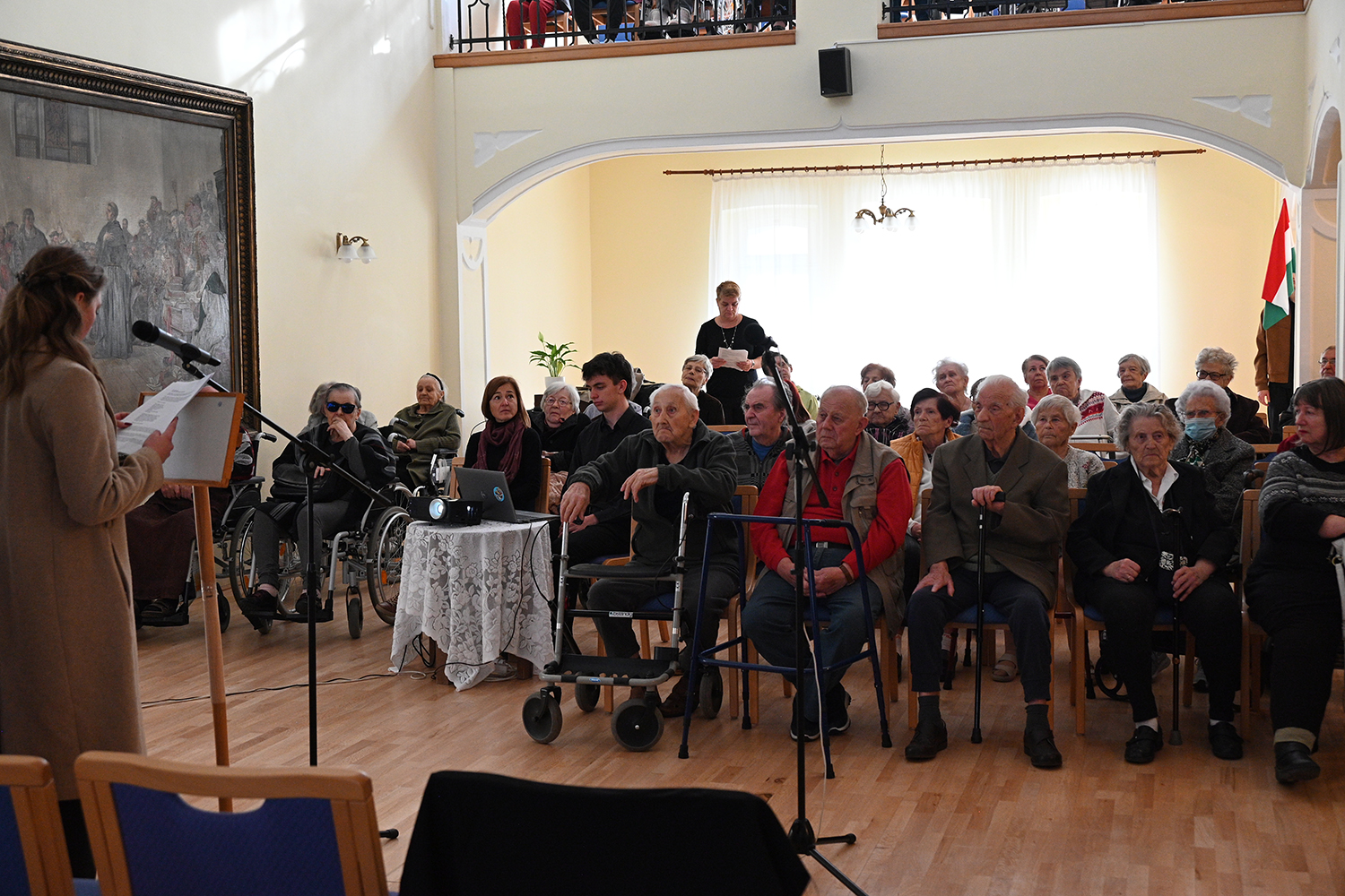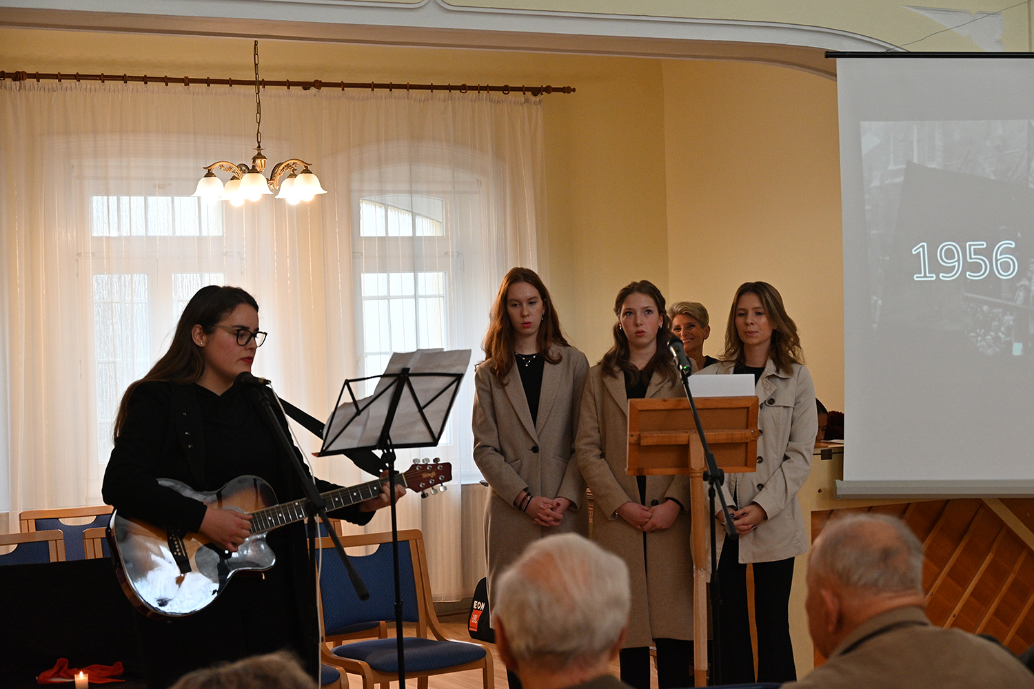 Okt. 22-én az 5. órában emlékeztünk meg a 11. évfolyam műsorával nemzeti ünnepünkről, az október 23-i eseményekről. A diákok által életre keltett jelenetek, emlékképek, dalok és versek méltó módon mutatták be az akkori eseményeket, történéseket. Nemcsak diákjaink láthatták ezt a színvonalas megemlékezést, hanem a szeretetotthon lakói is, hiszen nekik is előadták a műsort. Az otthon egyik lakója a műsor végén szót kérve hálásan, meghatódva meg is köszönte és elmondta, mennyire megérintette a megemlékezés, hiszen ő maga is tanúja volt az óvári eseményeknek.