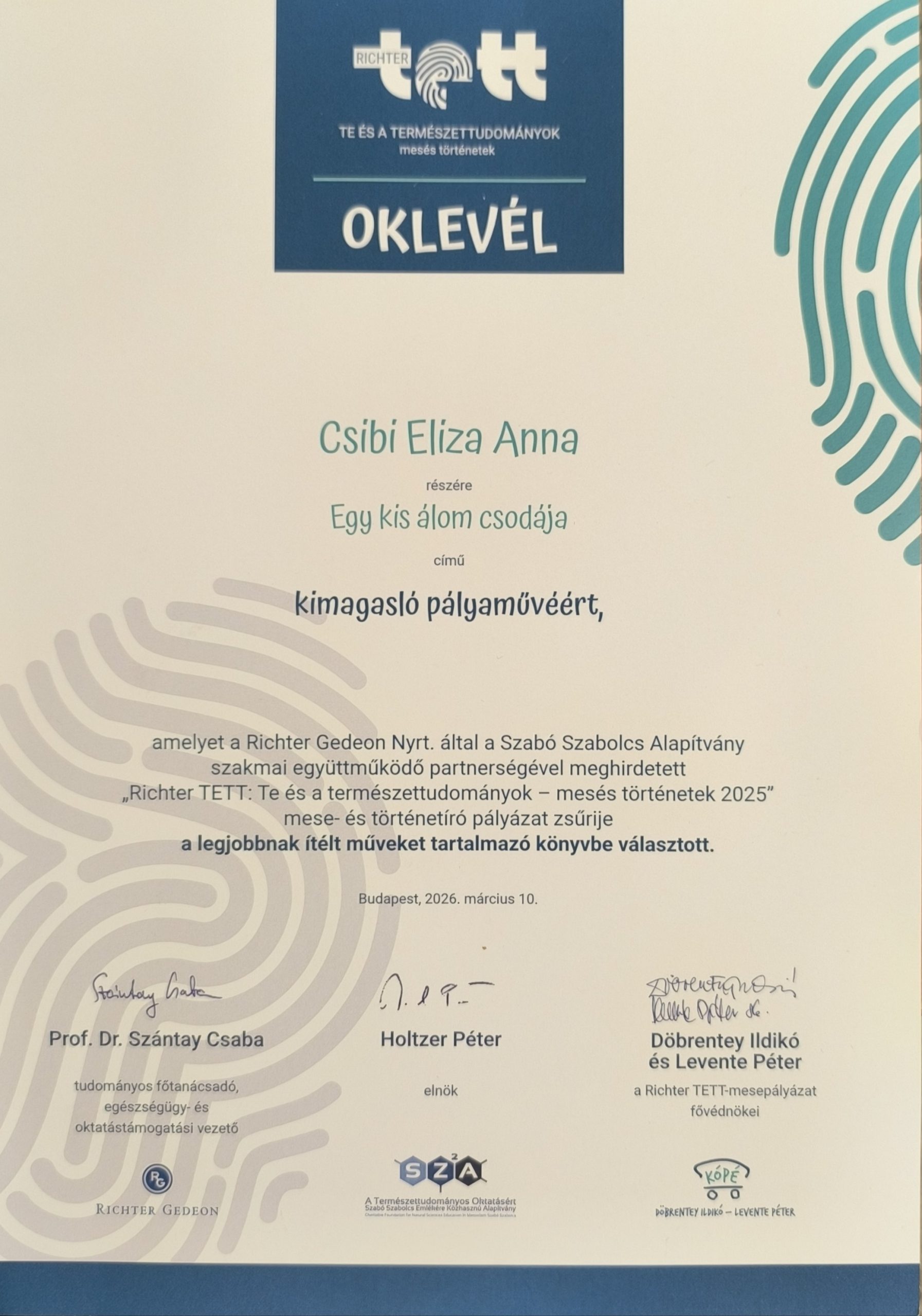 „Azért indultam a Richter TETT-mesepályázaton, mert szeretek írni és nagyon megtetszett a gondolat, hogy a legjobb mesékből könyvet adnak ki. A pályázat célja az volt, hogy egy kitalált mese segítségével bemutassuk a természettudomány egy érdekes részét. Három korcsoportban lehetett nevezni, én a 3-5. osztályosok között indultam.